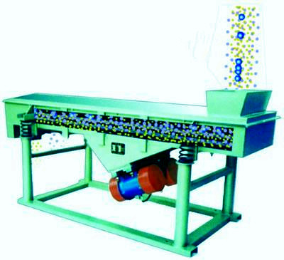 該機利用振動電機激振作為振動源,使物料在篩網上被拋起,同時向前作直線運動,物料從給料機均勻地進入篩分機的進料口,通過多層篩網產生數種規格的篩上物、篩下物、分別從各自的出口排出。